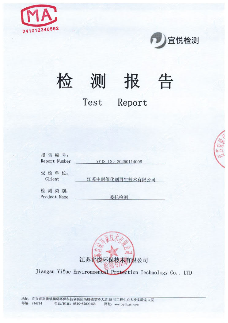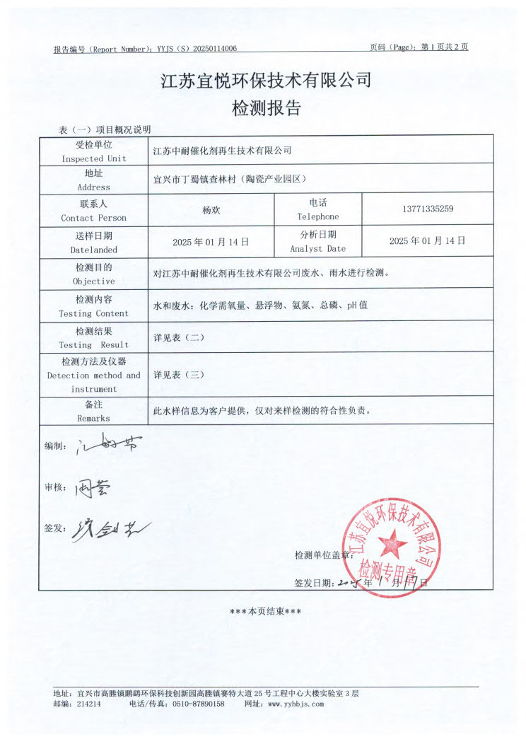 江蘇中耐催化劑再生技術(shù)有限公司廢水、雨水的檢測(cè)報(bào)告(采樣日期20250114)